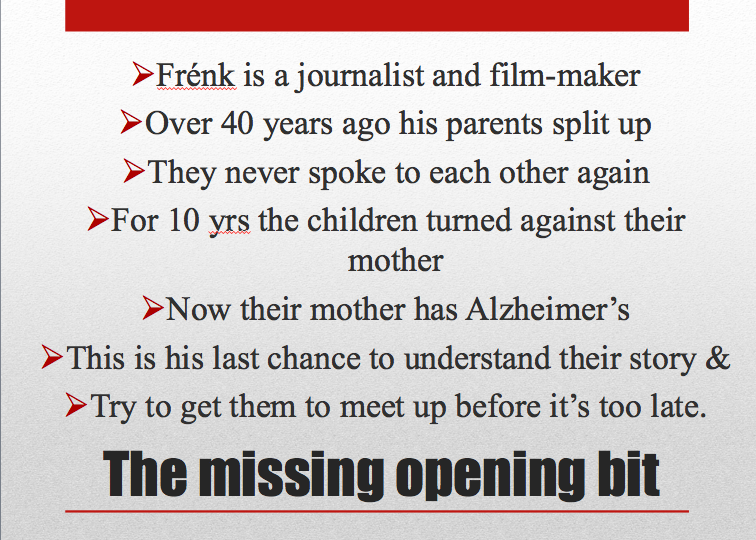 The film is a retrospective of Frénk’s parents’ marriage and divorce 40 years before, after which his parents never met up again … plus there was Alienation from their mother during the children’s teenage decade.