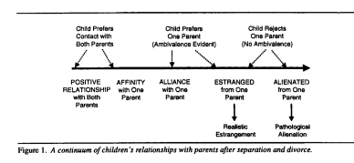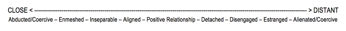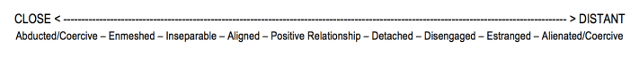 Where did you find the colorful version of the continuum? I would nitpick with one part of that image. That is, the estranged relationship is described as “non-ambivalent relationship.” I think that many neglected and abused children still have ambivalent feelings toward the abusive parent. E.g., they love Daddy when he is sober, but fear him when he is drunk.” But children who have been horribly abused no doubt lose their ambivalence and totally hate the abusive parent.