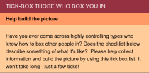 Last time we gave you a checklist about harmful psychological coercive persuasion. This time we want everyone to do a survey on it. The checklist is a general description of what happens in several places … in cults, terrorism, bullying, gangs, abusive relationships and other family conflict. With